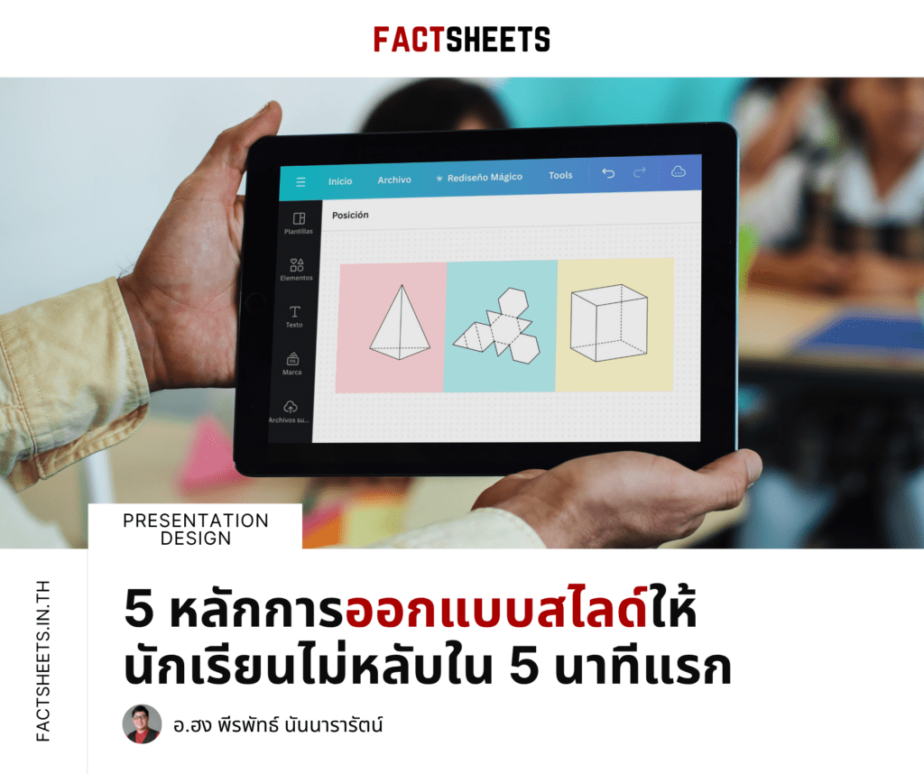 ถ้าใครเคยเจอเหตุการณ์แบบนี้ในห้องเรียนหรือเวิร์กช็อป ลองอ่านโพสต์นี้ดูครับ ผมจะมาเล่าให้ฟังถึง 5 หลักการง่ายๆ ที่ช่วยให้สไลด์ของเรา “น่าดู” และ “น่าจดจำ” มากขึ้น โดยเฉพาะในช่วง 5 นาทีแรกที่สำคัญที่สุด